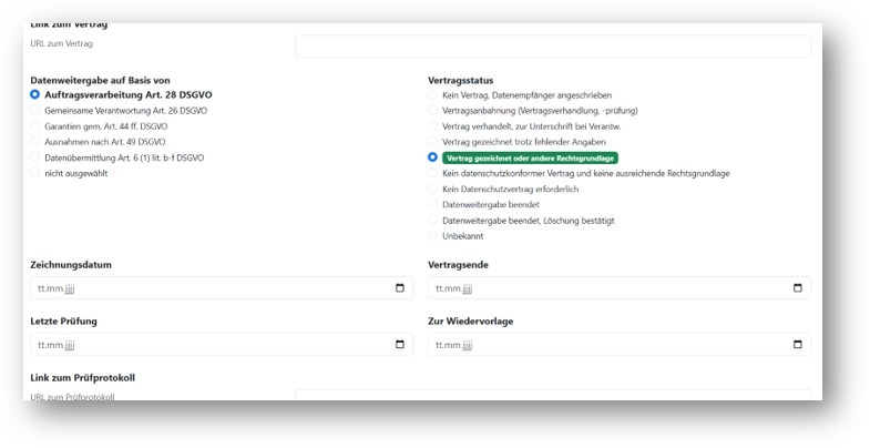 Die Verträge können hierbei direkt mit den jeweiligen Verarbeitungen, Fachapplikationen und Infrastruktur verknüpft werden.